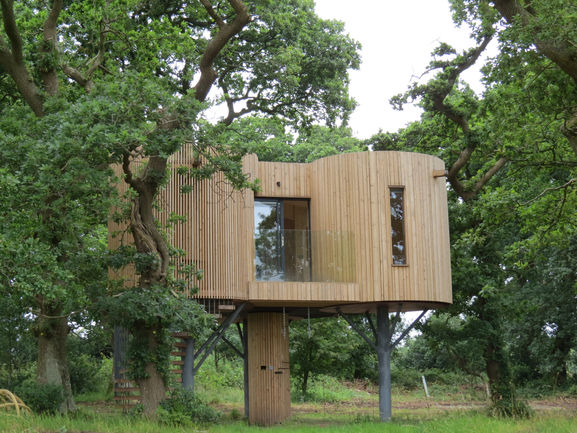 The interior’s natural palette comprises spruce walls, oiled engineered oak flooring, and birch fixtures with small leather, copper and concrete details. Externally, the treehouse is clad in larch timber of variable widths and sits on a steel substructure with central, timber clad service column.