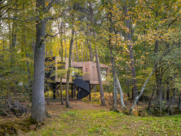 Commissioned as one of two Treehouses for the Astley Estate in Norfolk, Meander was designed to sit amongst ancient woodland , and takes its inspiration from its woodland context. The structure of the tree itself, its bark and the heartwood.
